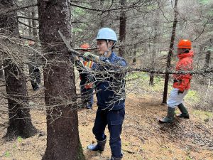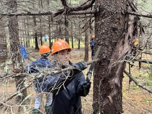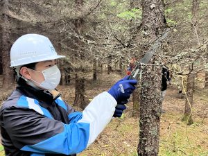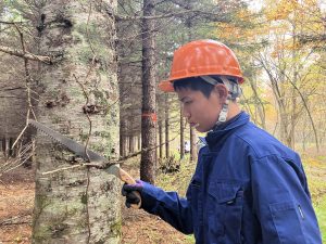 初めにヤマハミュージッククラフト北海道で製造しているピアノの部品(共鳴板)の作業工程を見学しました。その後、「おとの森」に移動し、松ぼっくり拾い、枝打ち作業をおこないました。一人2本のアカエゾマツ木を担当し、枝打ちを行いました。生徒達は真剣に責任をもって作業に取り組んでいました。