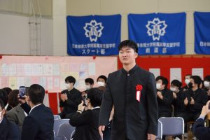 インフルエンザB型感染蔓延の影響で、卒業生全員そろっての参列はできませんでしたが、式は予定通り証書授与、校長式辞、理事長訓辞、在校生代表による「送辞」や卒業生代表による「答辞」、全校生徒による式歌「群青」、校歌斉唱と予定通り行われ、涙が溢れた温かい卒業式となりました。その後、部活動の見送りセレモニーで在校生からたくさんの祝福を受けました。